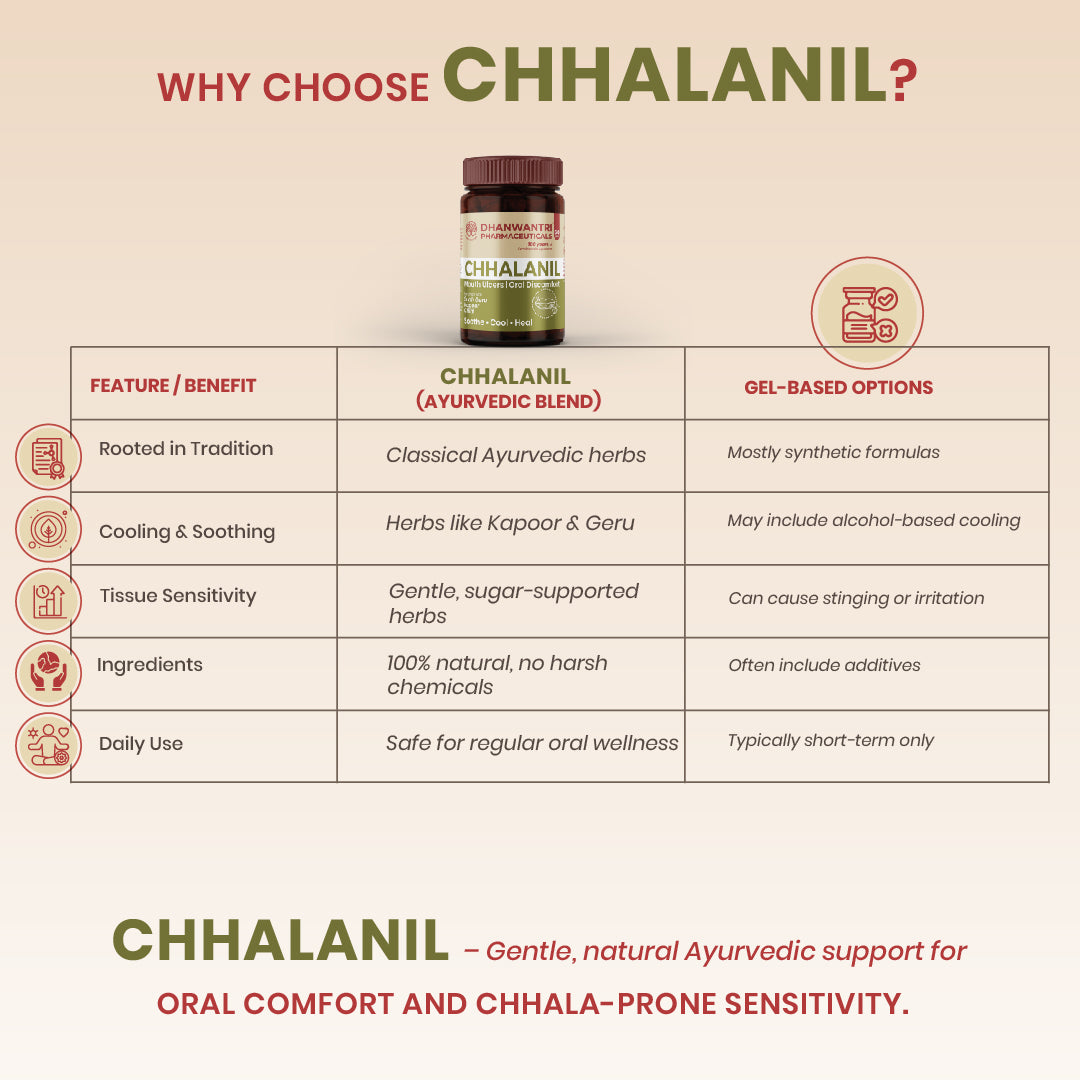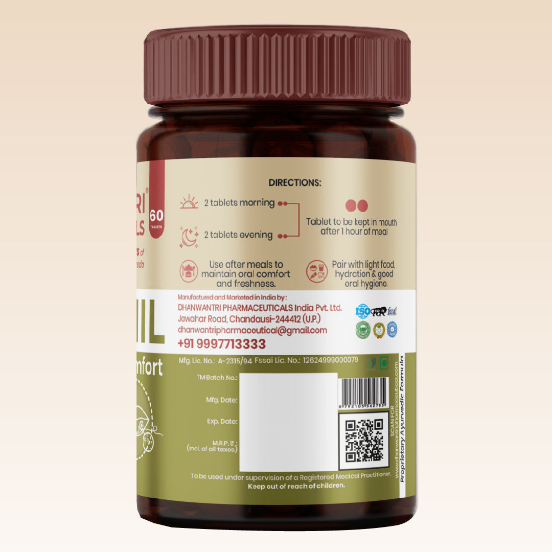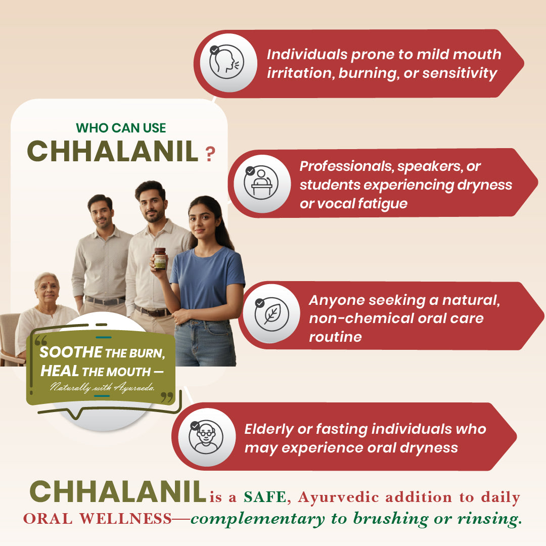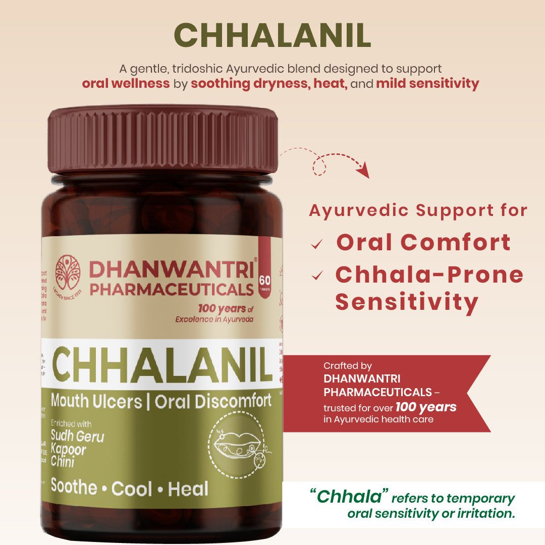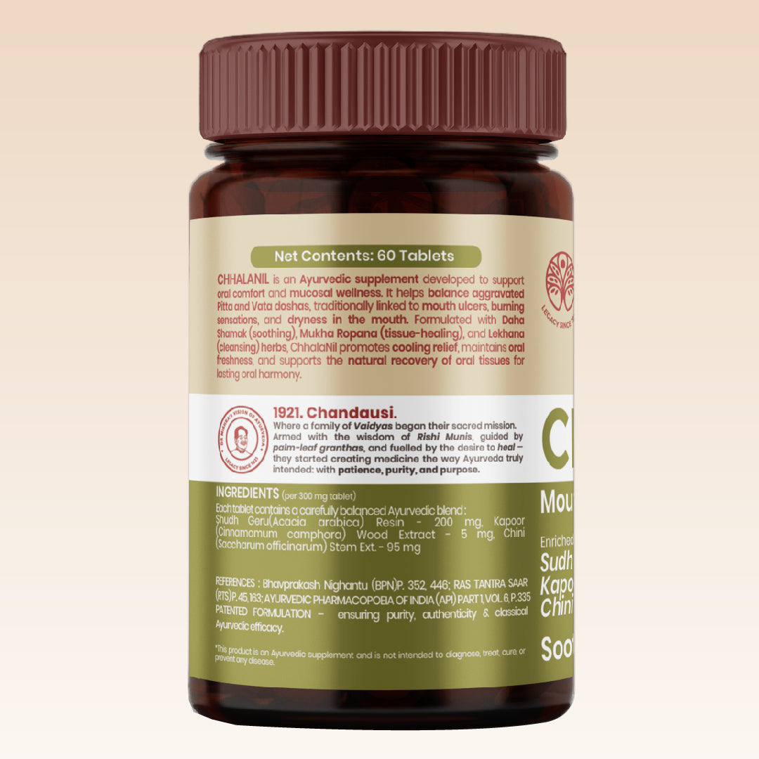 Daily stress, irregular meals, seasonal heat, and heat-inducing foods can influence oral comfort and freshness. ChhalaNil is a thoughtfully crafted Ayurvedic formulation designed to support cooling balance and maintain oral tissue comfort as part of a daily wellness routine.