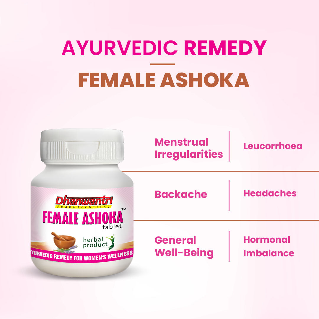 Tridoshic Ayurvedic Formula for Menstrual Balance, Hormonal Wellness, Leucorrhoea & Post-Delivery Uterine Care | With Ashoka, Lodhra, Ashwagandha & Praval Bhasma | 100+ Years of Ayurvedic Legacy - Female Ashoka is a proprietary Ayurvedic formulation crafted with time-tested herbs like Ashok Chhal, Lodhra, Ashwagandha, and Lal Chandan. It supports women’s wellness by promoting menstrual comfort, hormonal balance, and uterine strength. Whether for irregular cycles, heavy flow, or post-delivery weakness, Female Ashoka provides gentle yet effective support across different life stages. Trusted by women for over 100 years, it reflects Dhanwantri Pharmaceuticals’ legacy of authentic Ayurvedic innovation.