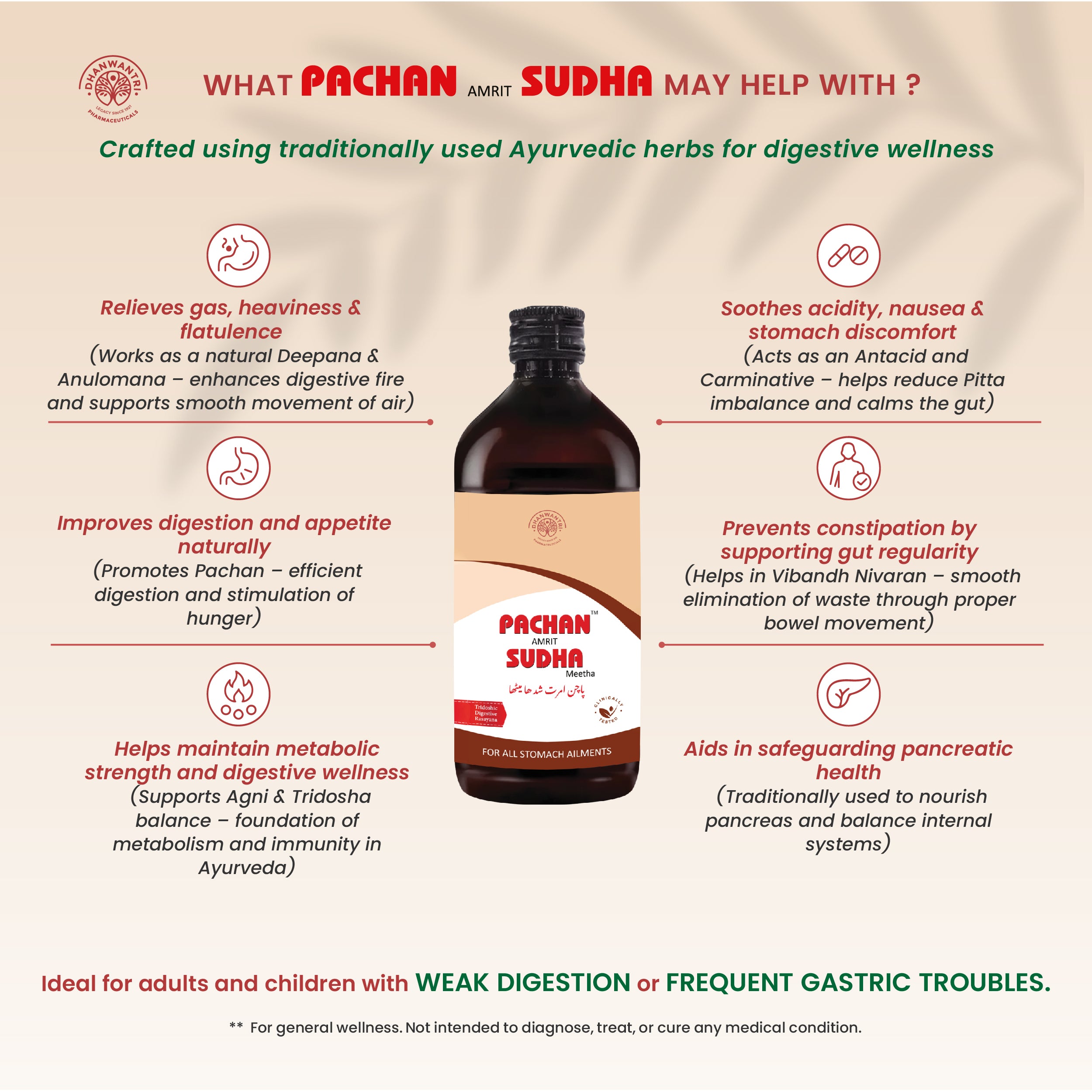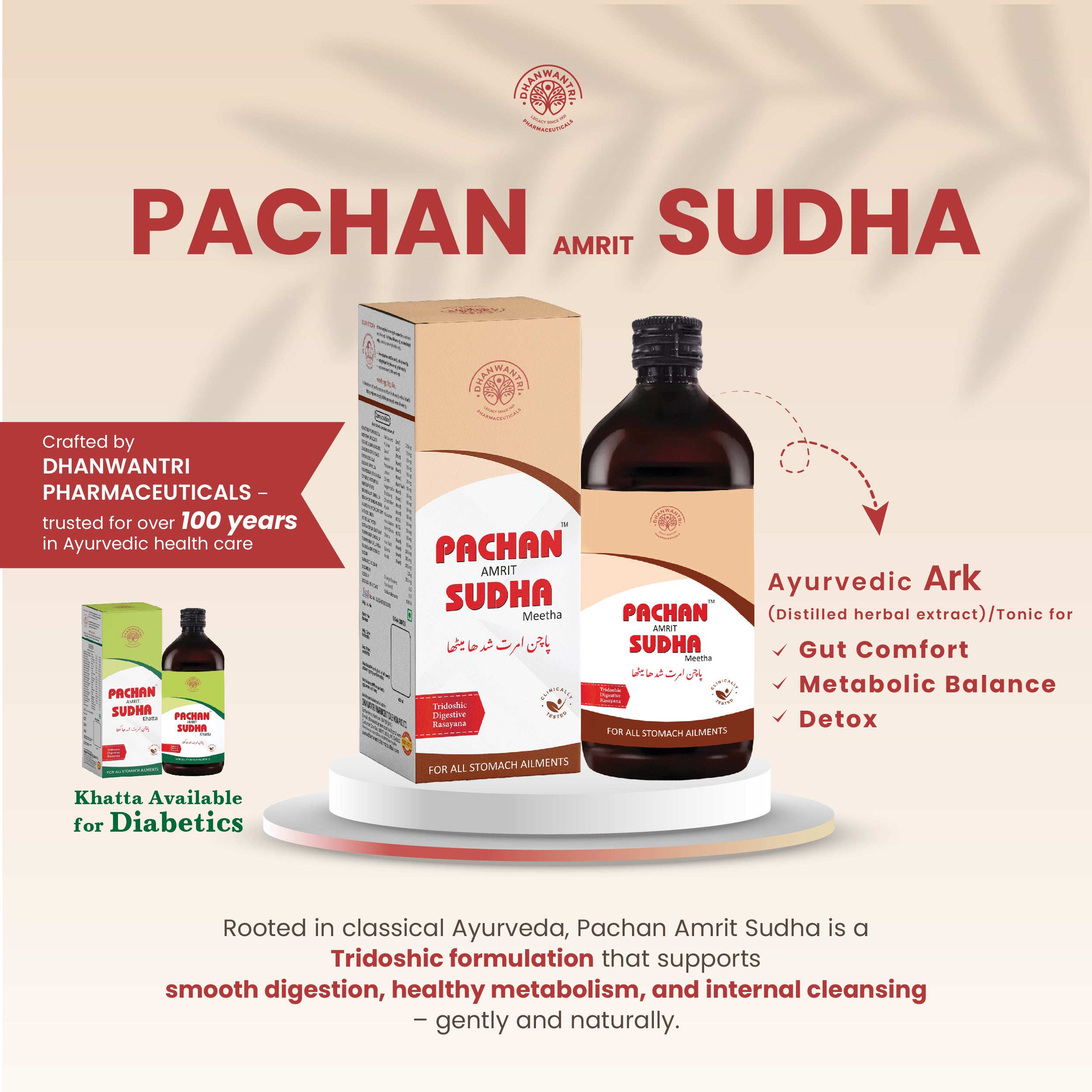 Pachan Amrit Sudha is a patented Ayurvedic Ark formulation crafted with herbs like Pudina, Saunf, Adrak, Lahsun, Ajwain, and Pippali. It provides gentle yet effective support for digestive wellness, helping relieve acidity, bloating, and constipation while promoting smooth digestion, metabolic balance, and natural detoxification. Whether after heavy meals, irregular eating, or lifestyle-related digestive stress, Pachan Amrit Sudha supports gut comfort, energy, and overall vitality. Trusted for over 100 years, it reflects Dhanwantri Pharmaceuticals’ legacy of authentic Ayurvedic innovation.