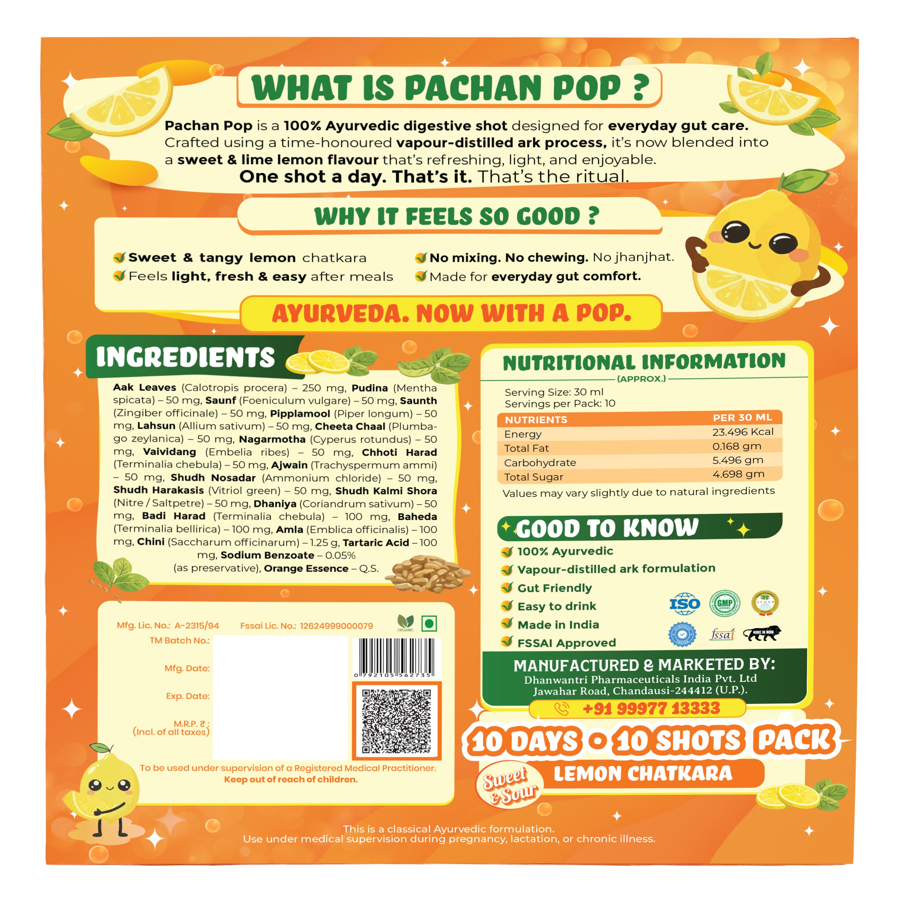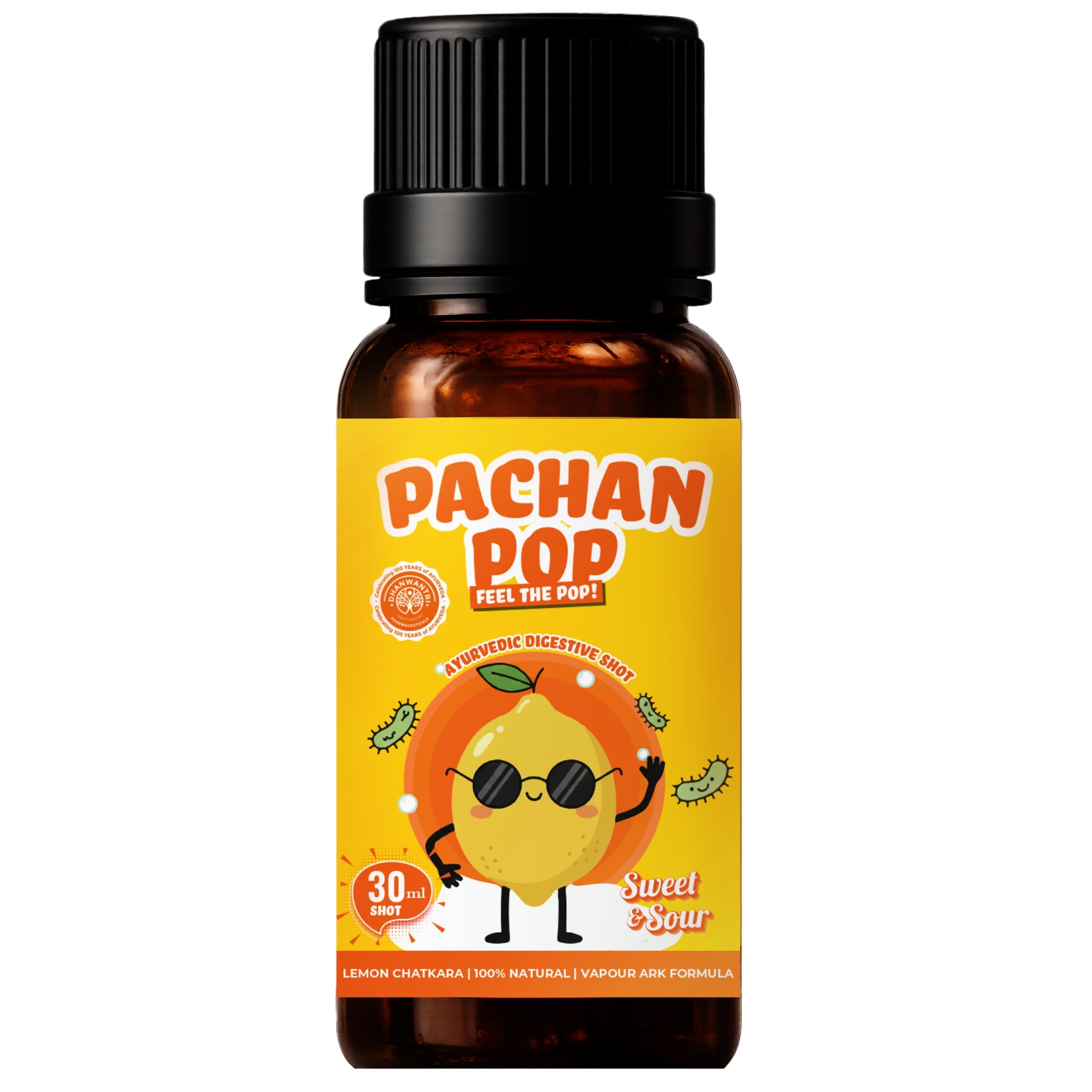 Pachan Pop is a ready-to-drink Ayurvedic digestive shot crafted for everyday gut comfort. Made using a traditional vapour-distilled ark process, it blends time-tested Ayurvedic wisdom with a refreshing sweet and tangy lemon chatkara flavour that feels light and enjoyable after meals.
