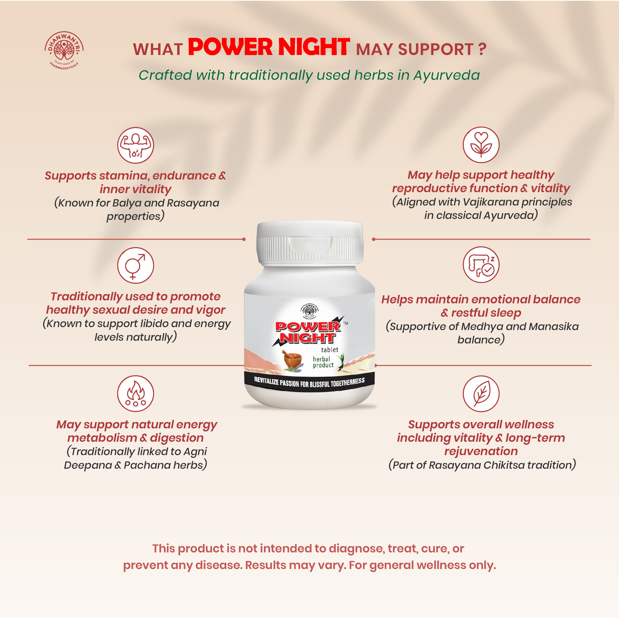 This powerful formula enhances strength, confidence, and endurance while nourishing the reproductive system naturally. Unlike synthetic stimulants, Power Night works on the body’s root cause by rejuvenating dhatus (tissues), supporting ojas (vital energy), and promoting long-term vigor without harmful side effects.