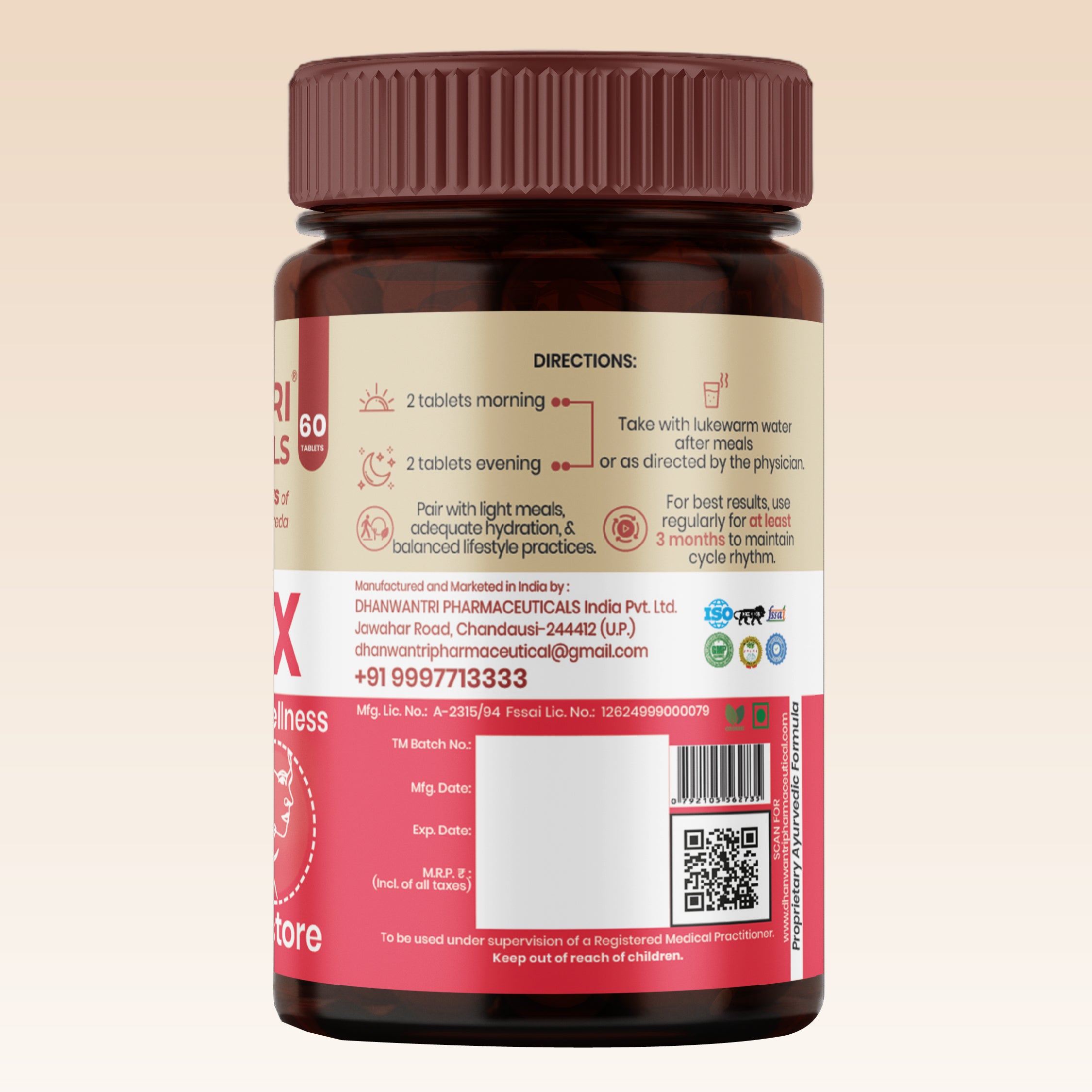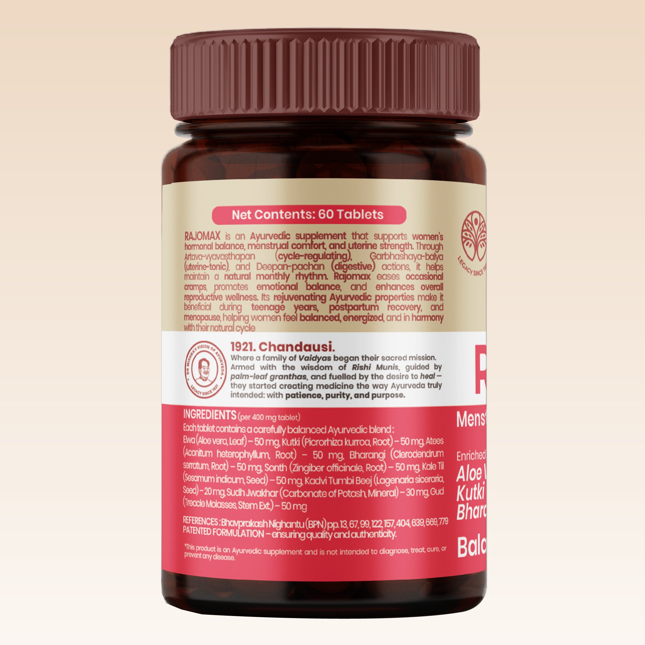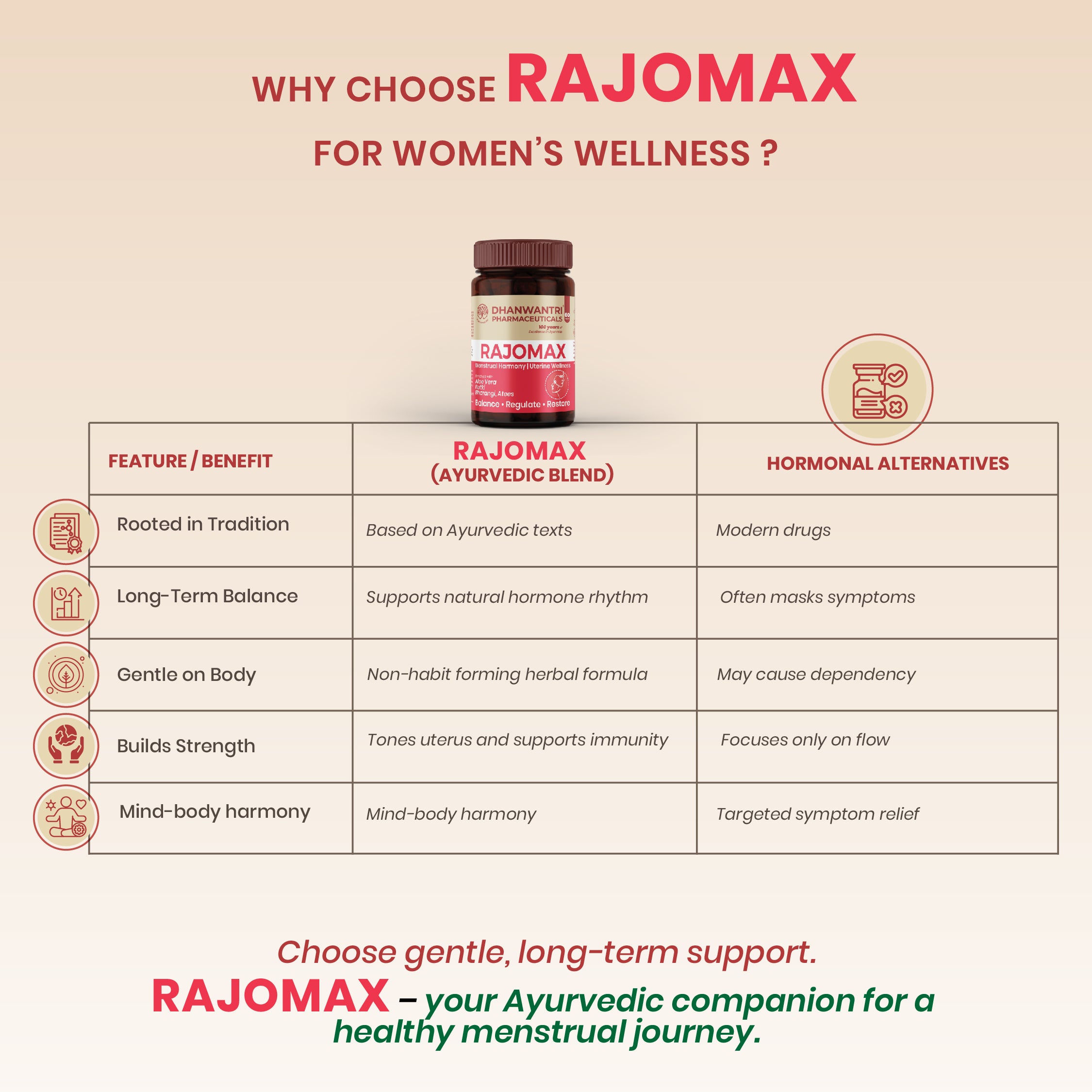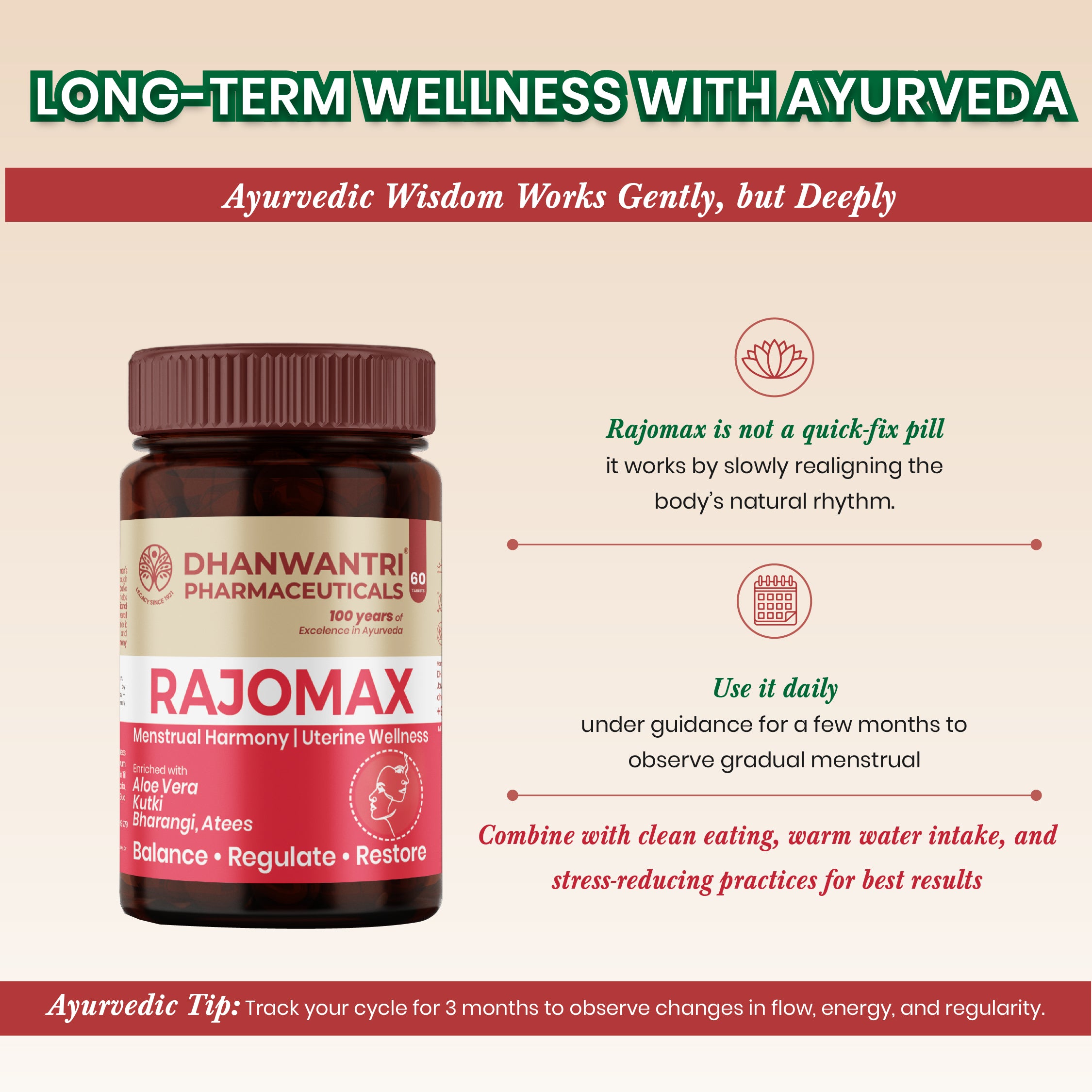 Developed by Dhanwantri Pharmaceuticals since 1921, RajoMax blends classical Ayurvedic wisdom with responsible modern manufacturing to deliver dependable daily support. Inspired by traditional principles, it focuses on supporting internal harmony rather than temporary masking, making it suitable for women seeking structured wellness rooted in tradition and long-term balance.