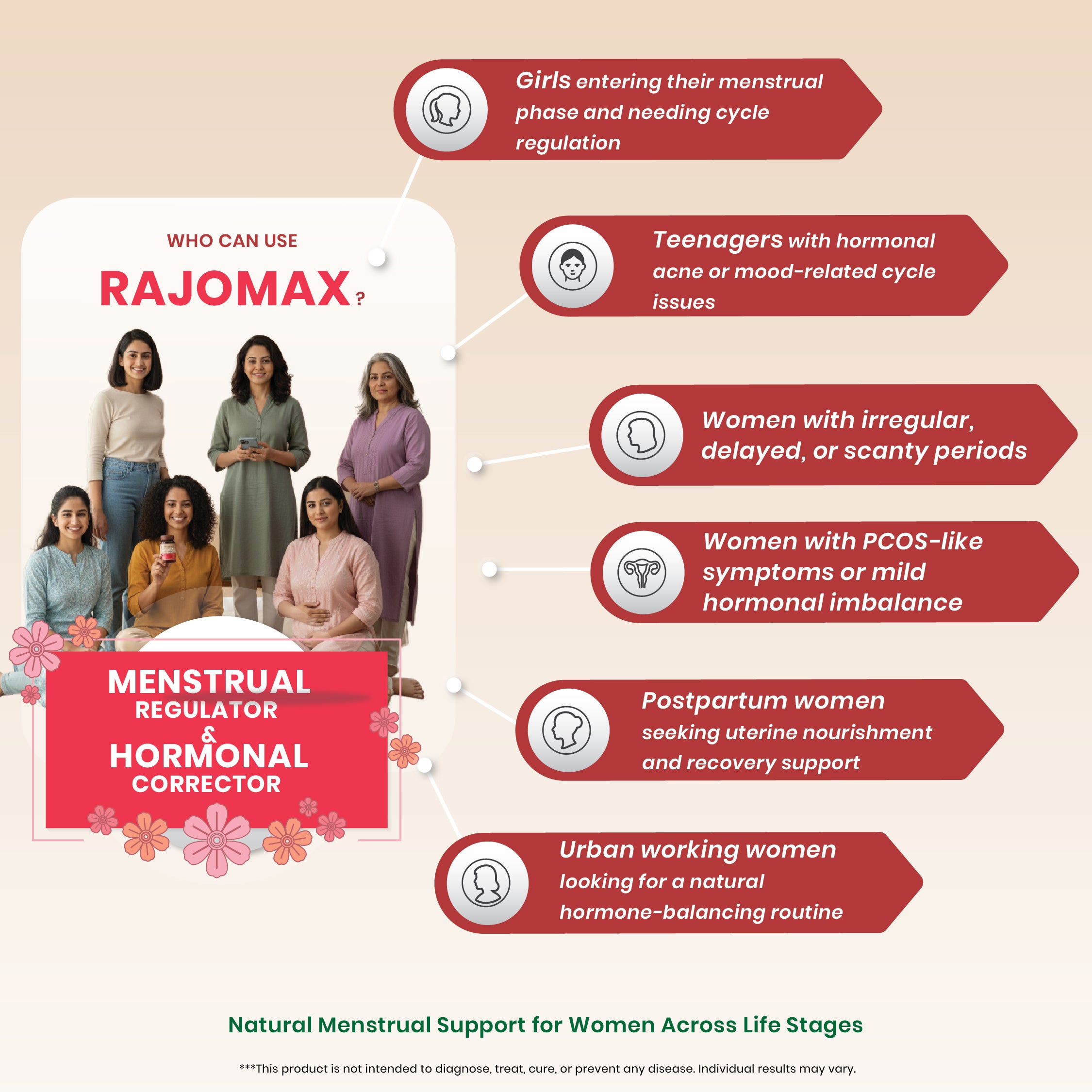 Modern routines, stress, dietary shifts, and lifestyle changes can influence monthly rhythm and overall vitality. RajoMax is a thoughtfully crafted proprietary Ayurvedic formulation designed to support menstrual comfort, cycle wellness, and women’s internal balance as part of a healthy lifestyle.
